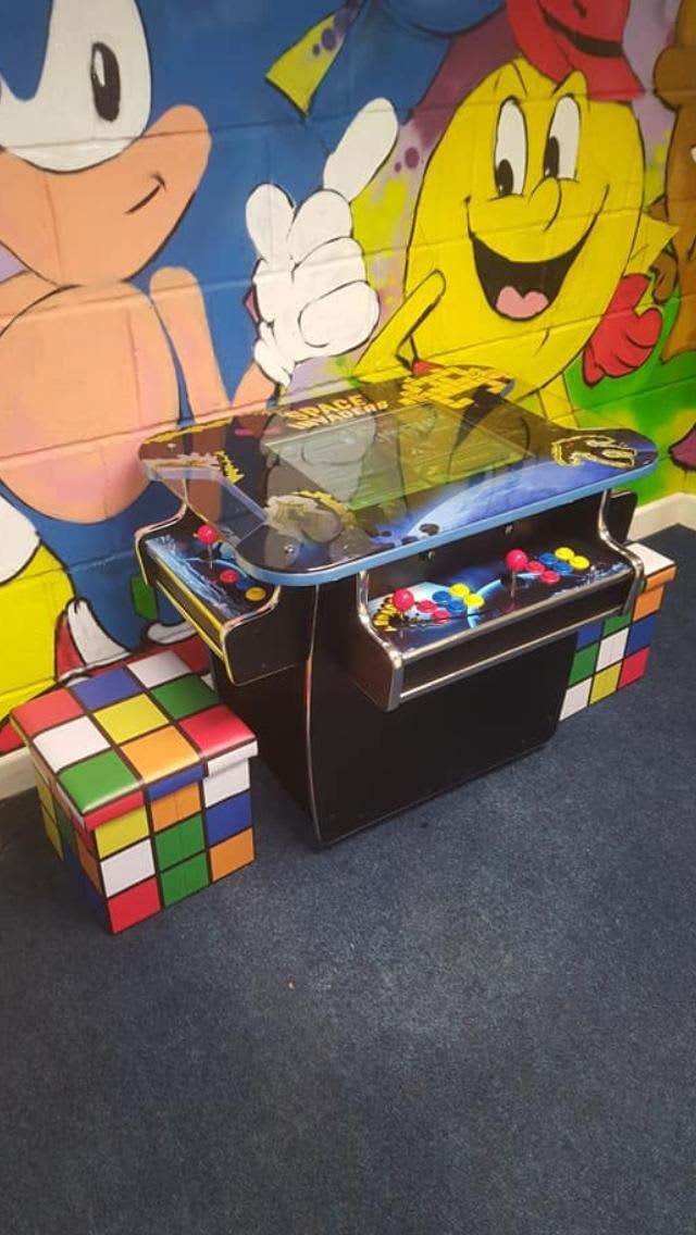 This is our table version retro arcade game. With its stylish design and brilliant colour scheme and seats to match this arcade game would be a hit with many events and would keep your guests entertained for hours of endless fun playing games like Donkey Kong, Pack-man, Galaga, Frogger, Galaxian, space invaders and many more.