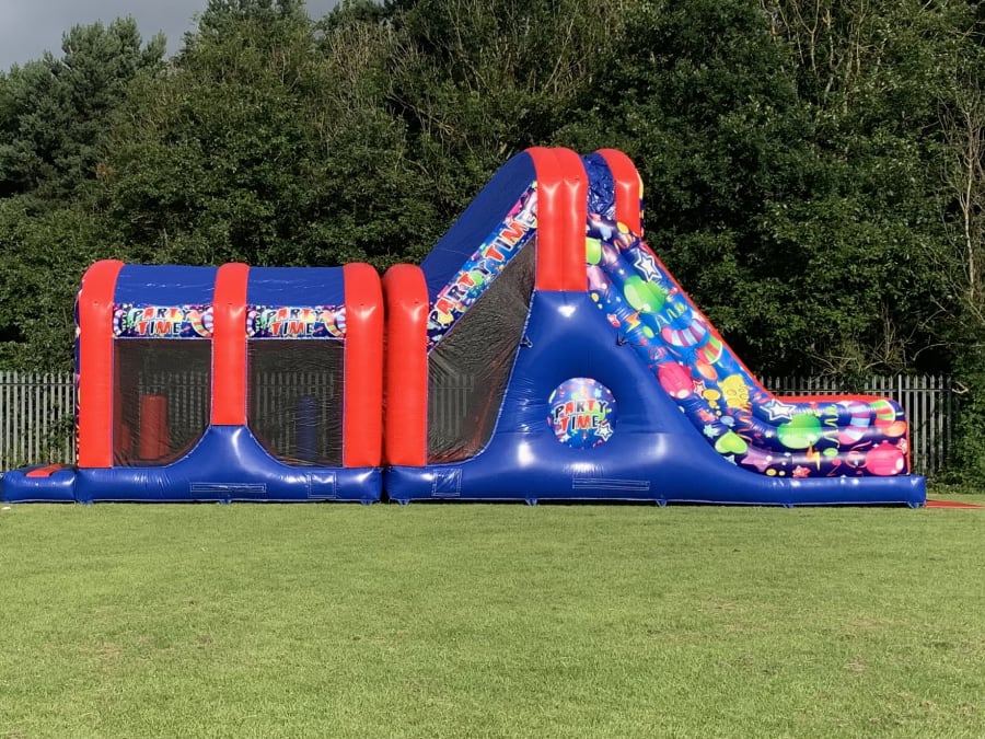 We have many different Inflatable Assault Courses to chose from on our website. This one is perfect for adults and children but unlike our standard assault courses this one has a 18ft mega slide fitted which has a 10ft platform to make it that little bit harder to race your rival to the finish. Our assault courses are great for many events like birthdays, fairs, galas, corporate team building and school end of term events.