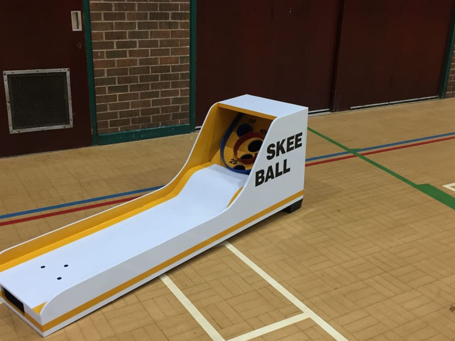 This is our retro skeeball game. The game itself is great fun and the player must have the eye of a hawk and skill to roll the ball up the ramp and get it to jump into one of the scoring circles on the board. The smaller the circle the higher the score will be.