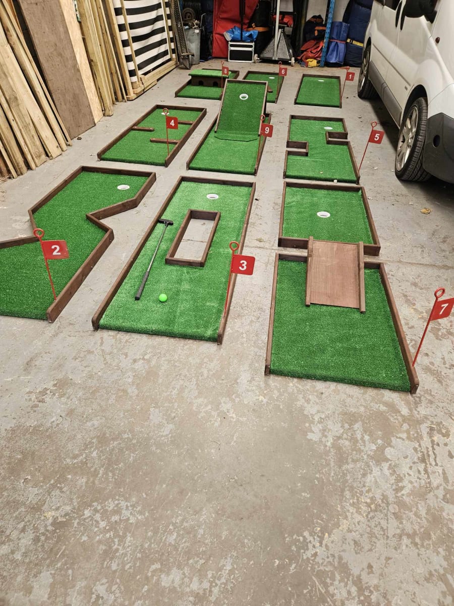 This is our portable 9 Hole Mini Golf, Crazy golf course which comes with 27 meters of playing surface that has a variety of challenges to over come. The crazy golf can be used indoors and outdoors and is suitable for many different events and can be used by children and adults.