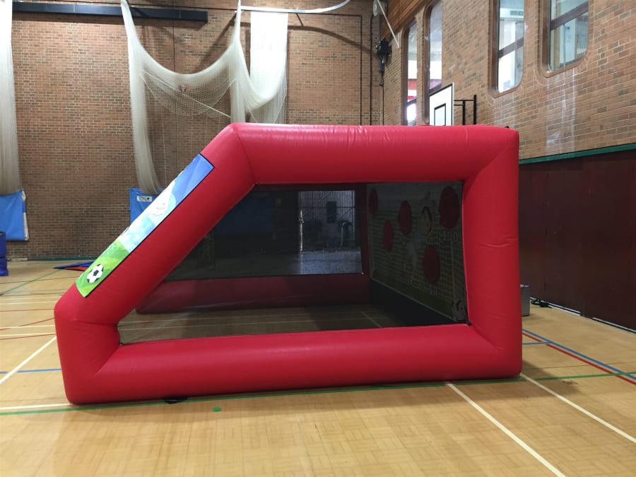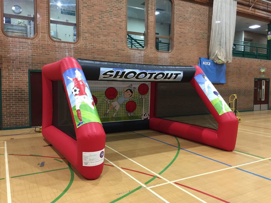 This is our 10x12x8 sports arena penalty shootout which is a classic football game which is suitable for many different events like sports days, football tournament's, team building, school fates and more. The aim of the game is each player gets 3 shots at the shootout to try and get the footballs through the holes in the net at the back which has scores beside each one, the more difficult the shot the higher the score.