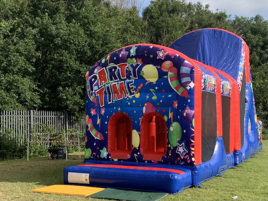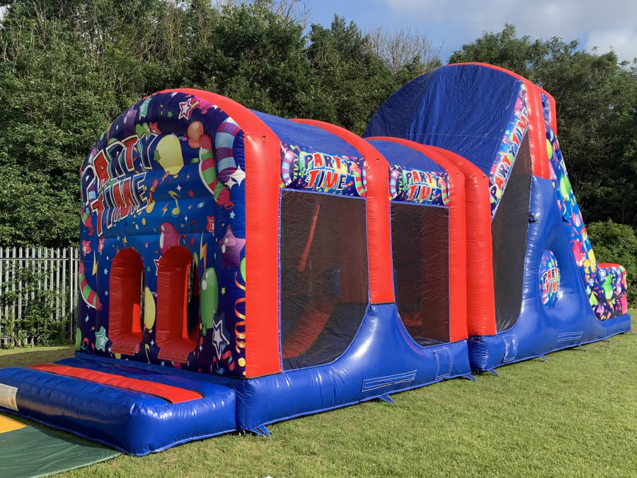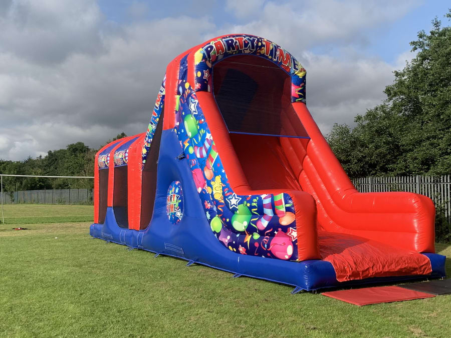 We have many different Inflatable Assault Courses to chose from on our website. This one is perfect for adults and children but unlike our standard assault courses this one has a 18ft mega slide fitted which has a 10ft platform to make it that little bit harder to race your rival to the finish. Our assault courses are great for many events like birthdays, fairs, galas, corporate team building and school end of term events.