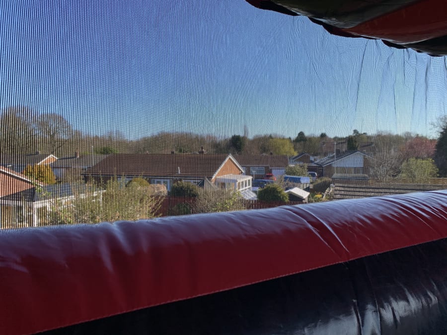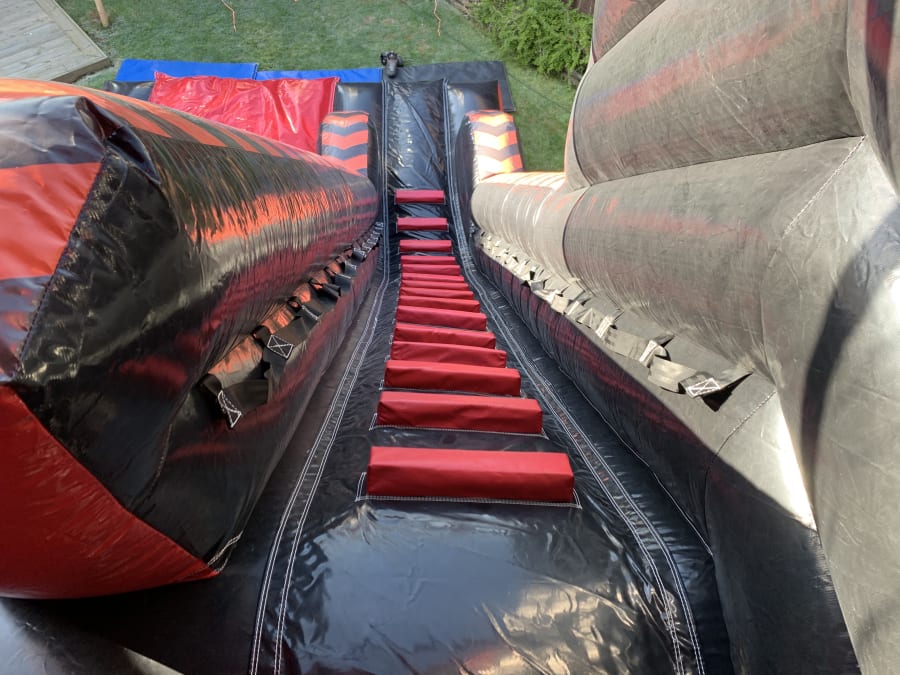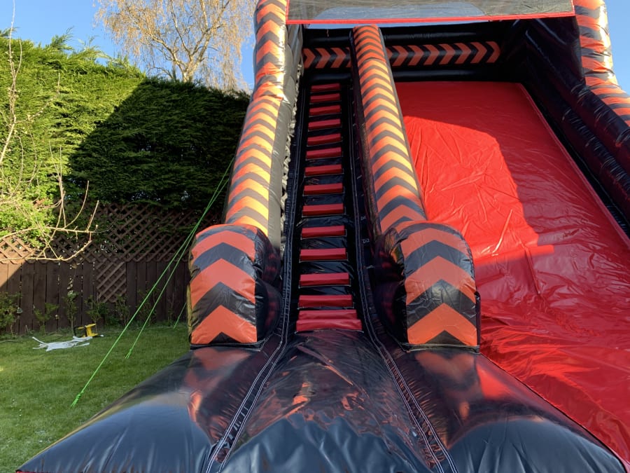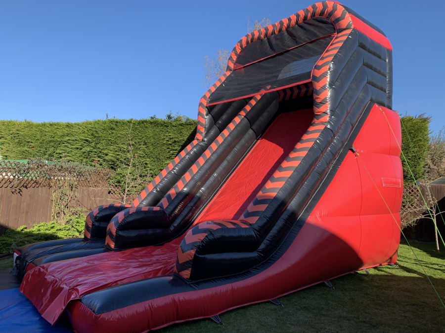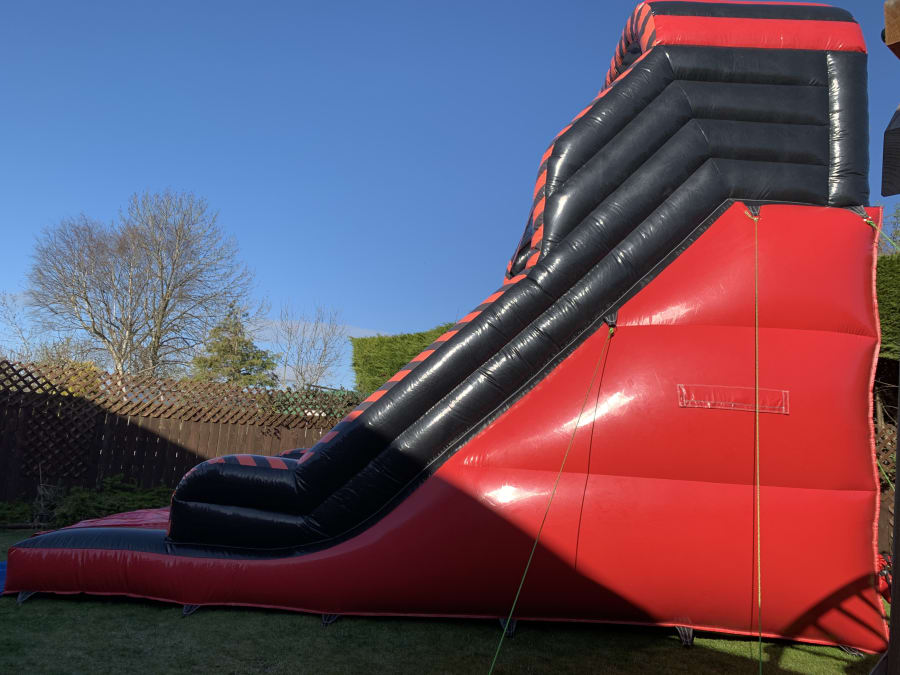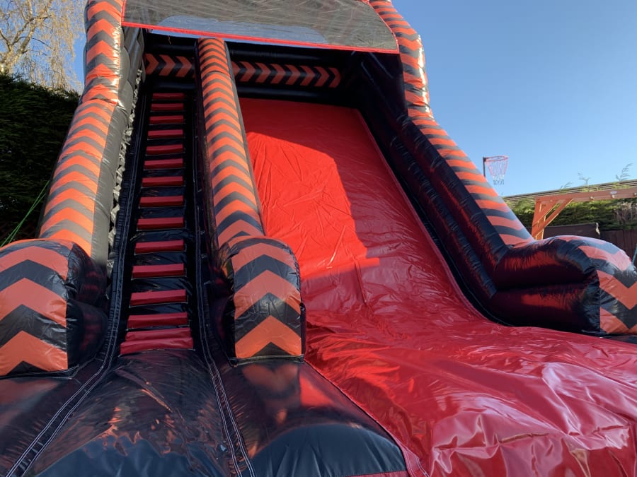 This is our 16x23x25 adult red and black hyper mega slide which is suitable for adults and children. It has a platform height of 12ft and stands at 25ft tall. The slide is suitable for many different events including , birthdays, corporate, school fates or even garden hires to name a few.