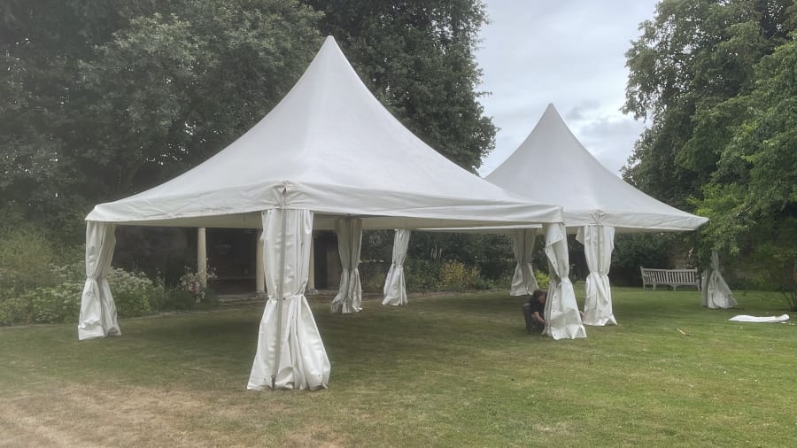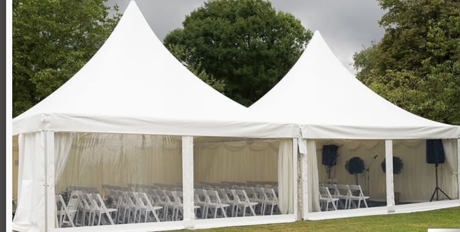 This is one of our most popular marquees we have its perfect for many events. It measures 6m x 12m in diameter and can quite easily accommodate 80 guests seated or 120 standing. This pagoda marquee can be hired with or without sides and we can also supply