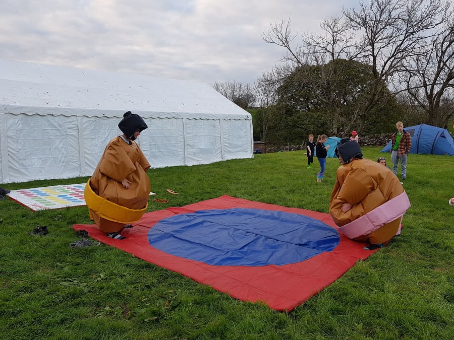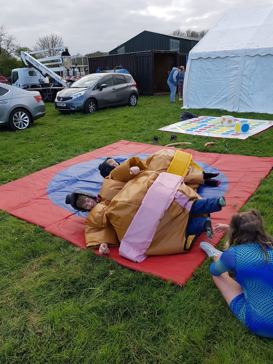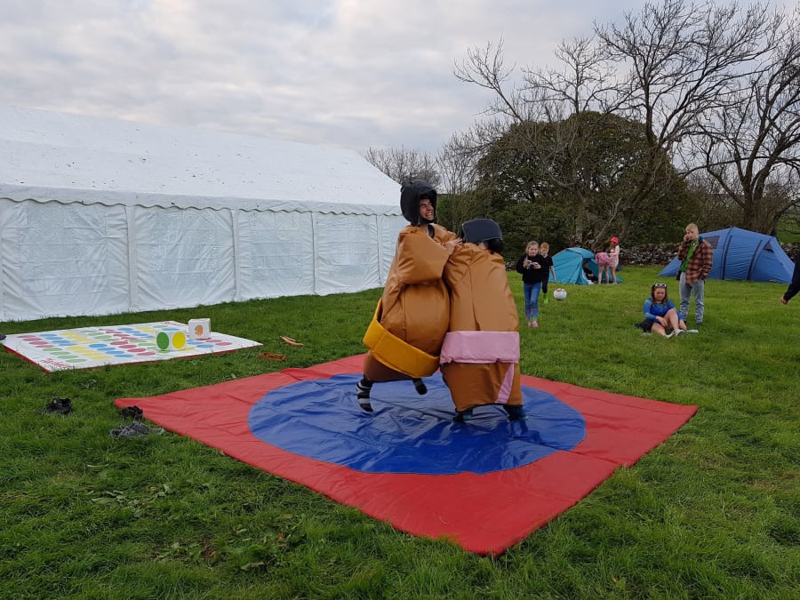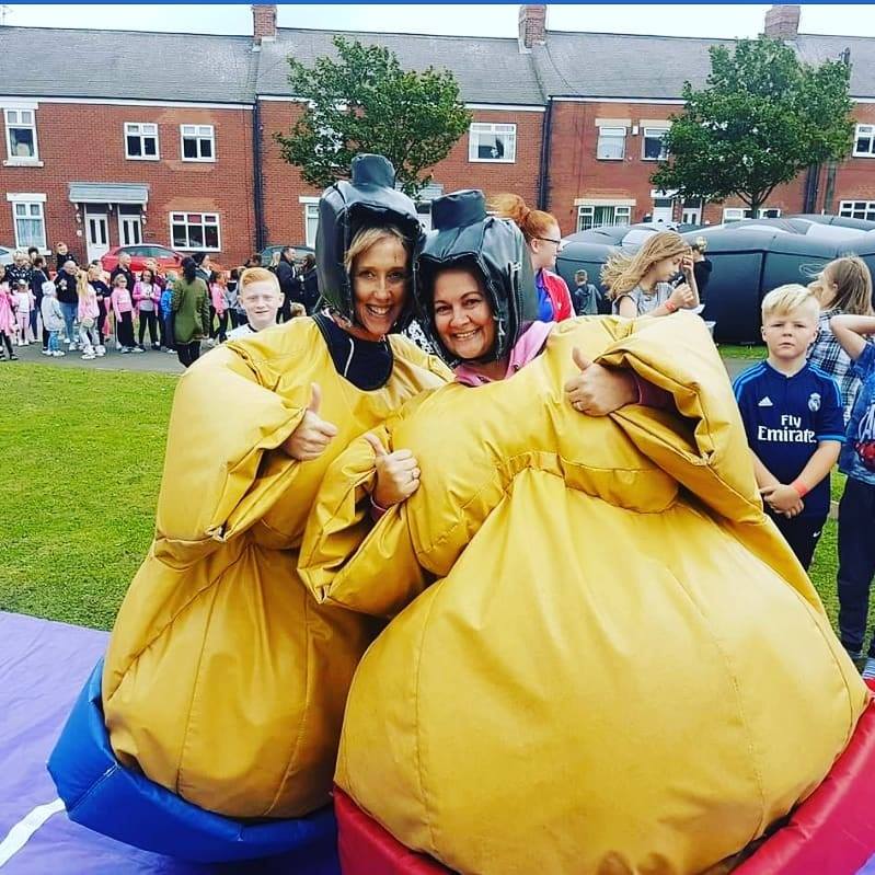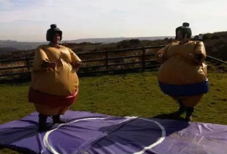 Adult sumo wrestling suits, you could become a champion sumo wrestler without the weight gain but with all the fun. The aim of the game is to push, pull, belly bounce and try with all your strength and whit to get the other sumo out of the circle on the mat or pin them on the floor, this game is as much fun for the spectators as it is for the contestants. So why not give them a go and see if you can be the next sumo champ. What you will get with your hire is 2 sumo suits, 2 helmets, 2 neck guards and 1 large padded mat. The age limit for these suits is 13 yrs to 70 years old and are suitable for indoor or outdoor use.